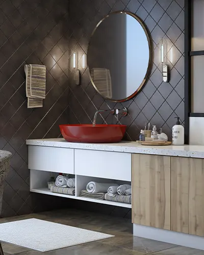 Wash areas are equally important spaces in a dining room. We try to make it look extraordinary in every possible way with dainty mirrors and lighting.